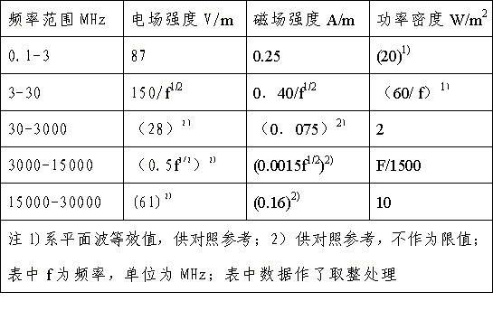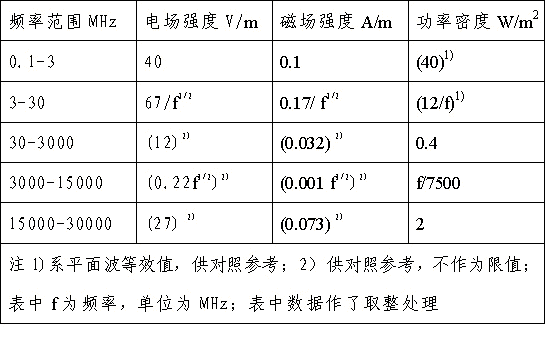 4、對(duì)于脈沖電磁波,除滿足上述要求外,其瞬時(shí)峰值不得超過表中1、2所列限值的1000倍。