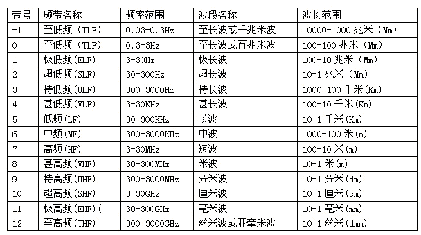 目前,根椐《中華人民共和國(guó)無線電頻率劃分規(guī)定》,我國(guó)已對(duì)9K~1000GHz頻帶內(nèi)的無線電業(yè)務(wù)做出了規(guī)劃,對(duì)無線電頻帶和波段也做了命名(見表1)。